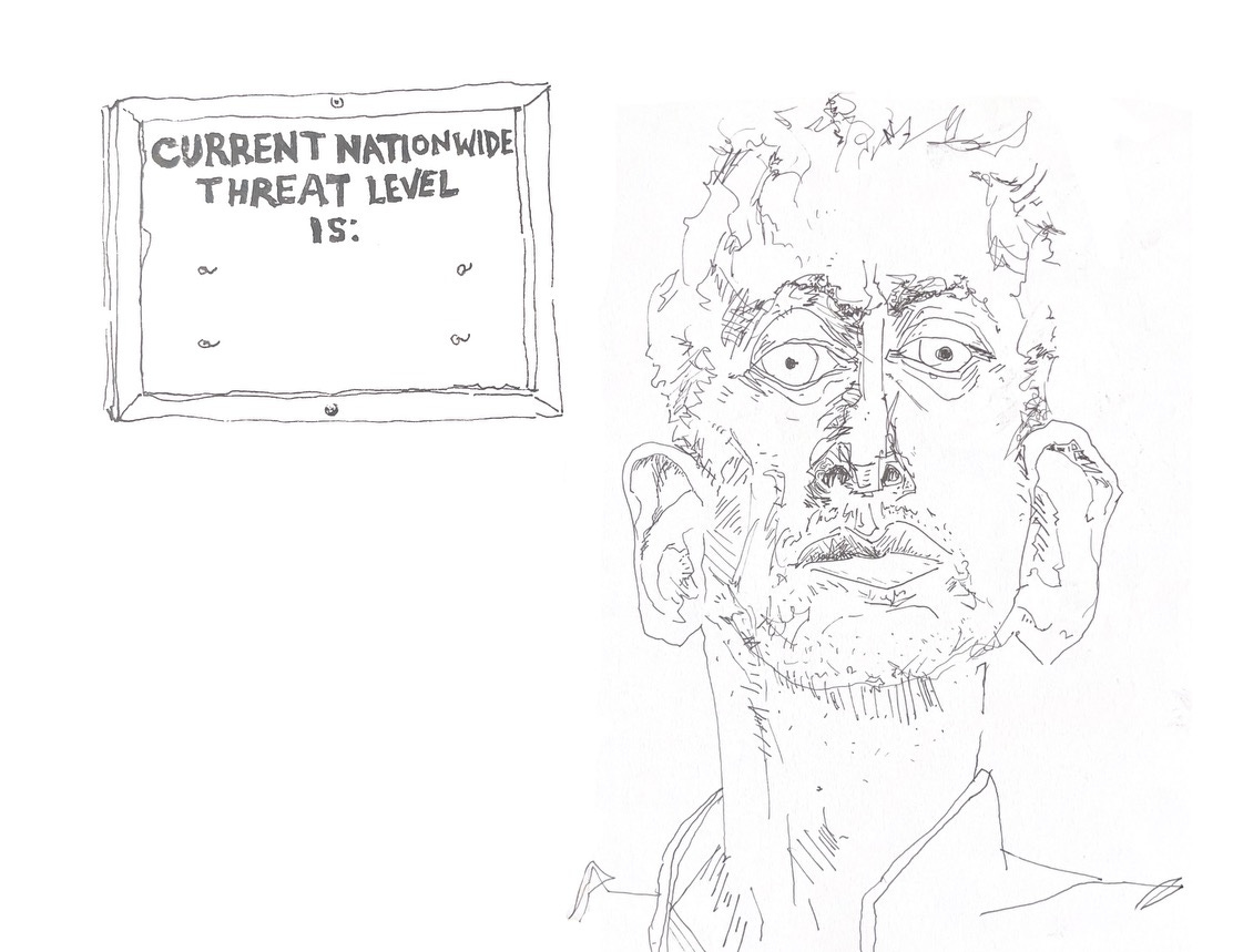“Current Nationwide Threat Level is ______” I thought, the sun in the eyes of the sideways fish, and the sun in mine.